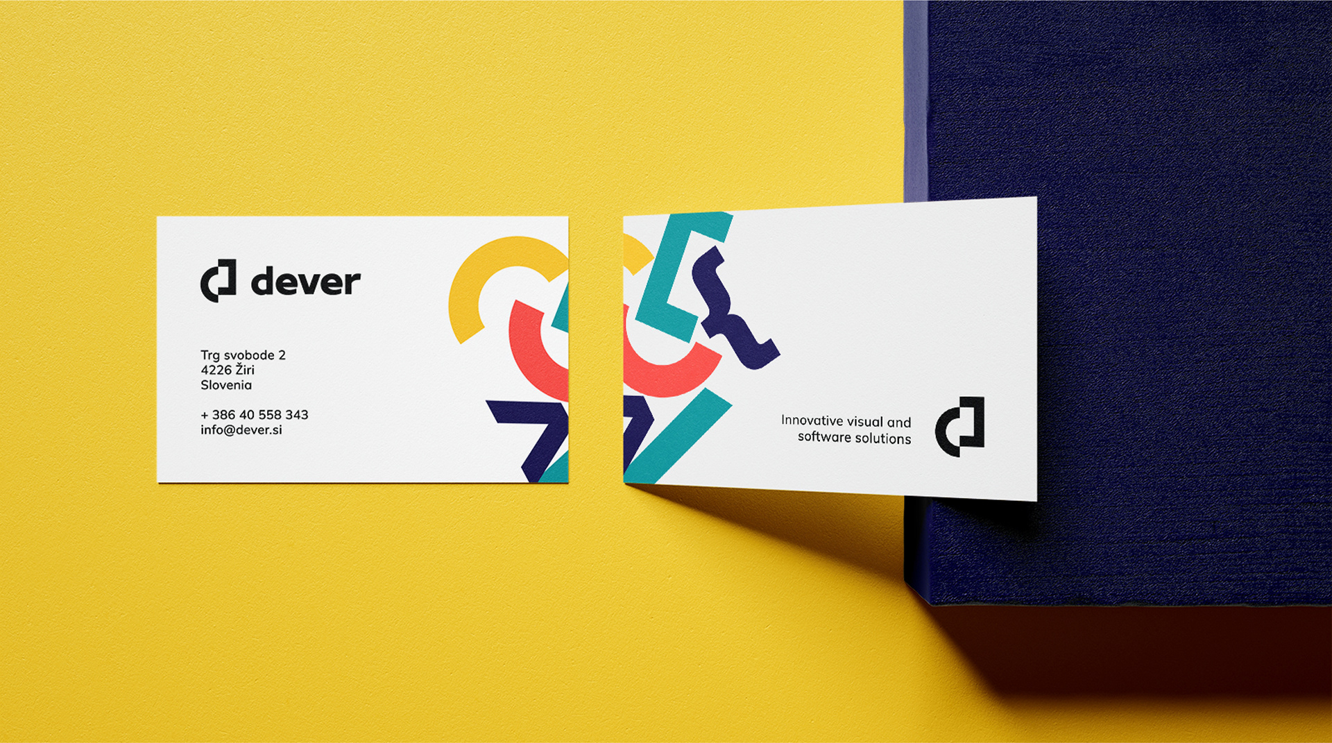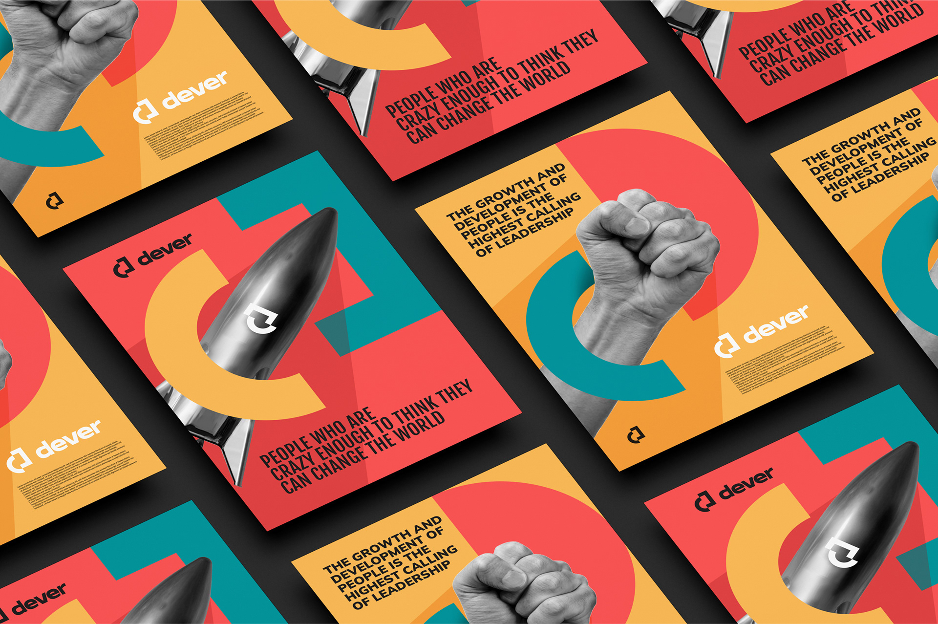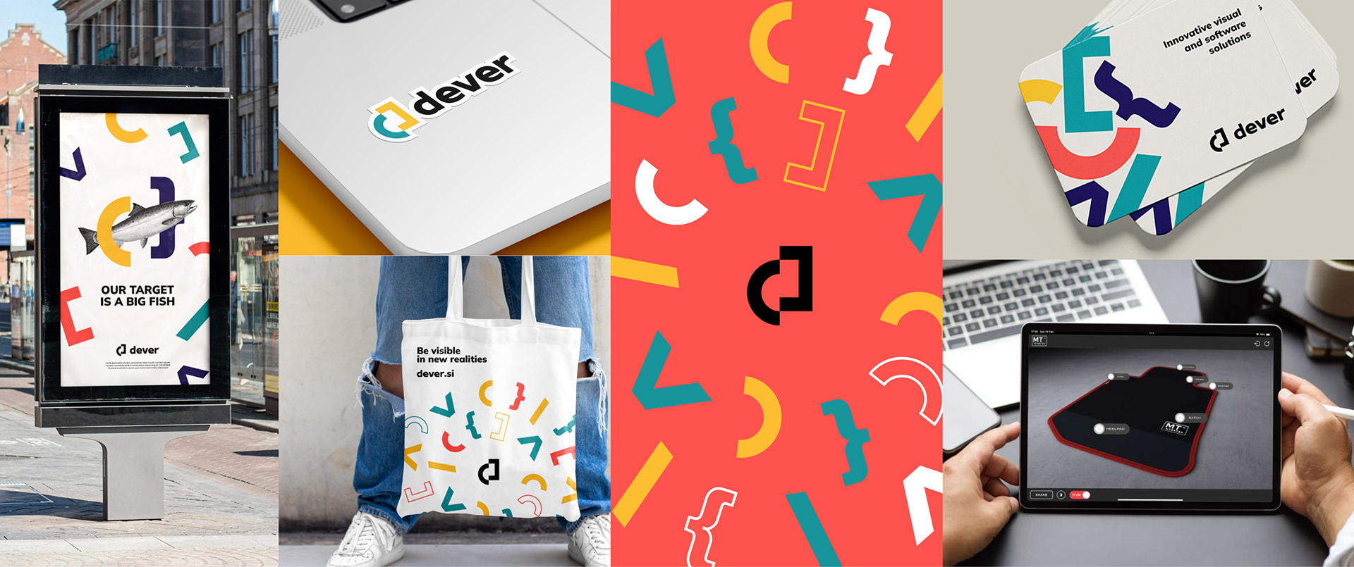 Zdecydowaliśmy się wykorzystać te spostrzeżenia do kształtowania naszych ilustracji. Wybraliśmy styl z odważnymi kolorami i geometrycznymi kształtami nawiasów jako główny element ich tożsamości marki, aby pokazać ich wiedzę w zakresie kodowania, a czarno-białe zdjęcia nadają ilustracjom efekt 3D i kontrastują z płaskimi mediami. Poprzez ilustracje opowiadamy, jak Dever wykorzystuje technologie immersyjne, aby pomóc swoim klientom: