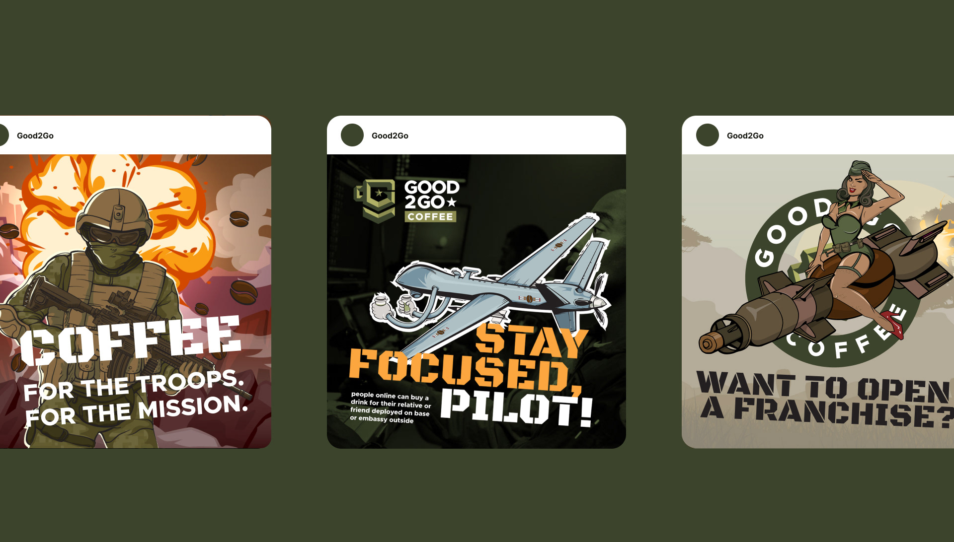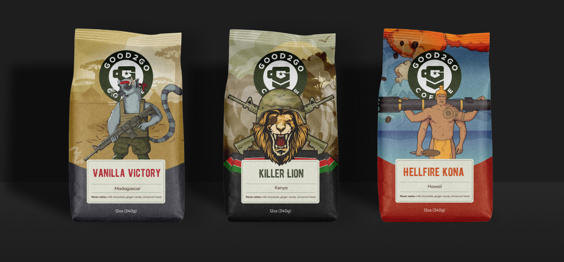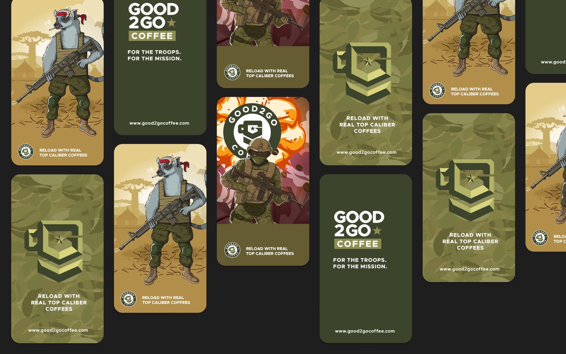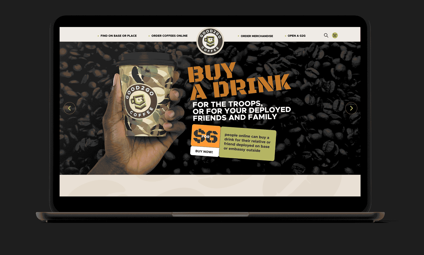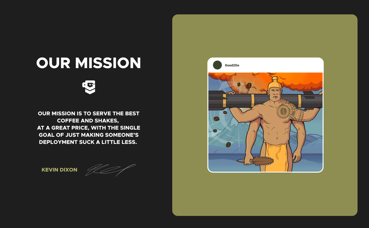 Good2Go to nie tylko firma kawowa. To przedsiębiorstwo z misją, które dostarcza wysokiej jakości, starannie wyselekcjonowaną i mocną kawę do najbardziej odległych baz amerykańskich na świecie, podnosząc morale żołnierzy i tworząc trwałe przyjaźnie. My w Good!Good!Brands byliśmy zaszczytczeni i podekscytowani pracą z nimi nad stworzeniem tożsamości marki, która odzwierciedla ich wartości, wizję i pasję.
