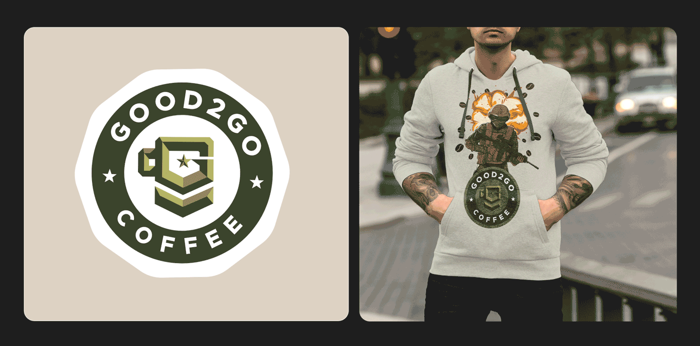 Po kilku rundach opinii i udoskonaleń, sfinalizowaliśmy projekt logo dla Good2Go. Logo składa się ze stylizowanej odznaki rangi zawierającej filiżankę kawy w formie litery G i gwiazdę w środku, jako nawiązanie do armii USA.
