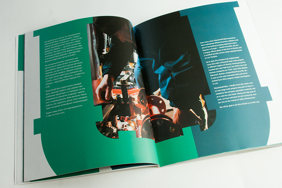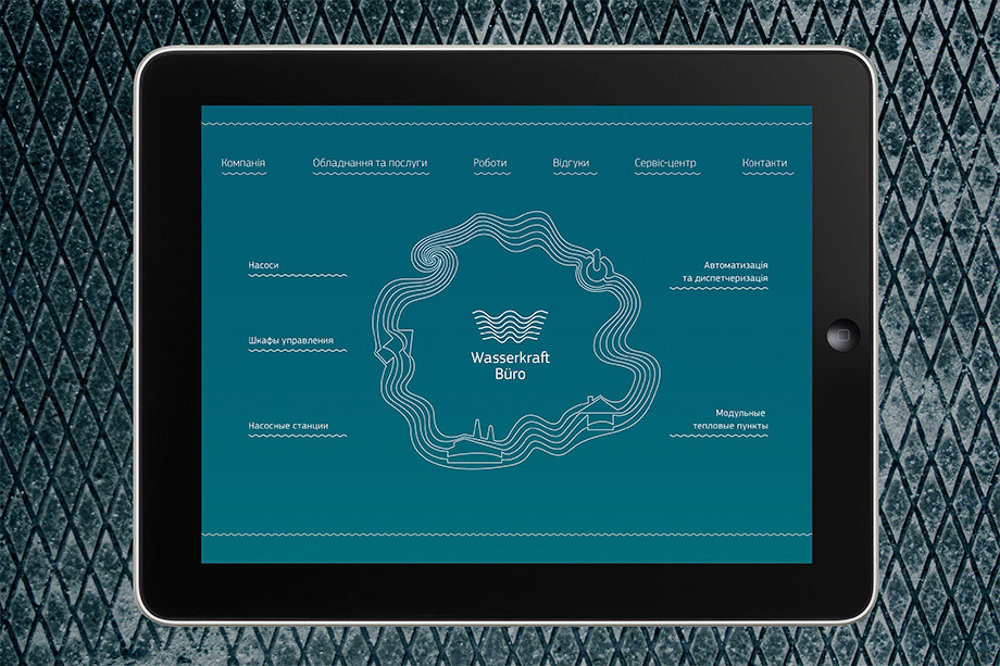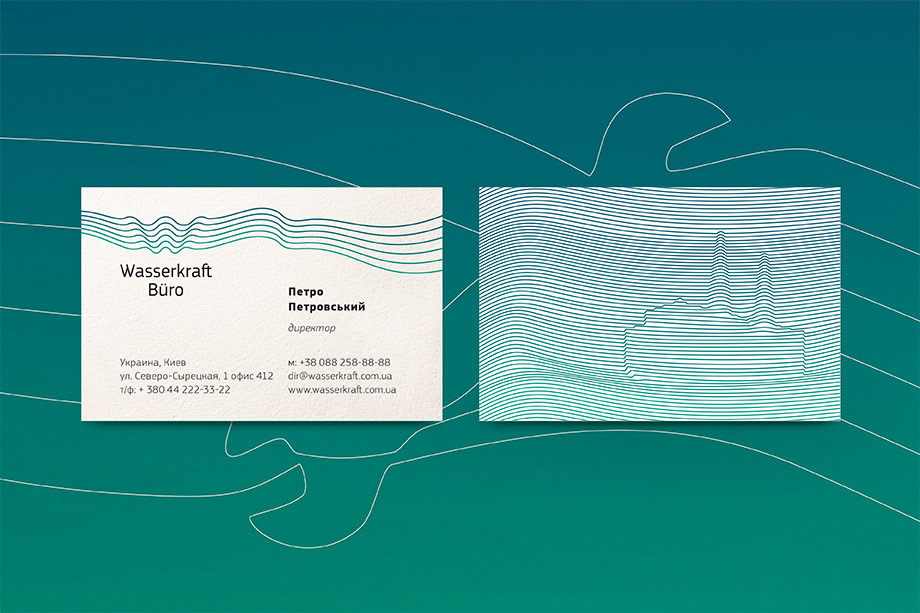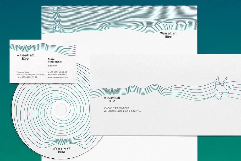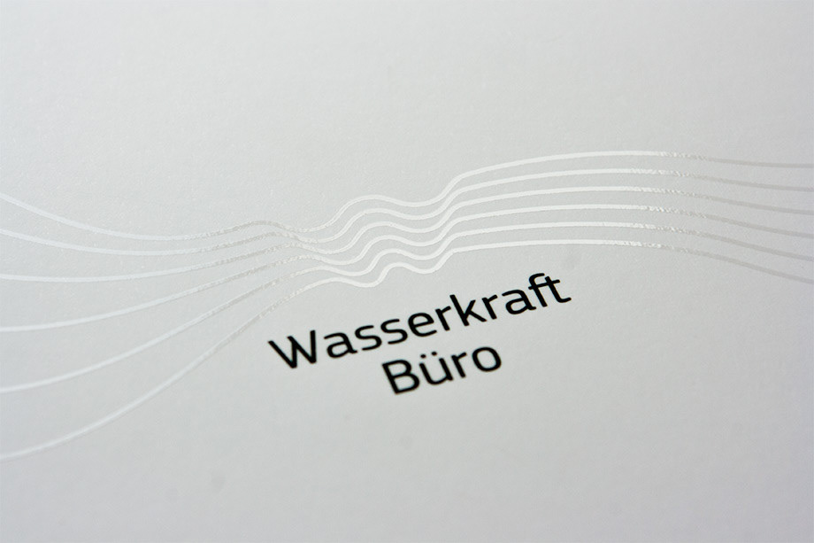 So we put the water flow pattern on every detail (from paper clip to the factory logo) to show unique Wasserkraft Büro identity style. Water flows through the logotype the same way water flows through the equipment that Wasserkraft Büro installs. The company’s got the name which is best to denote its sphere of activity and accentuate that Wasserkraft Büro is an engineering bureau.